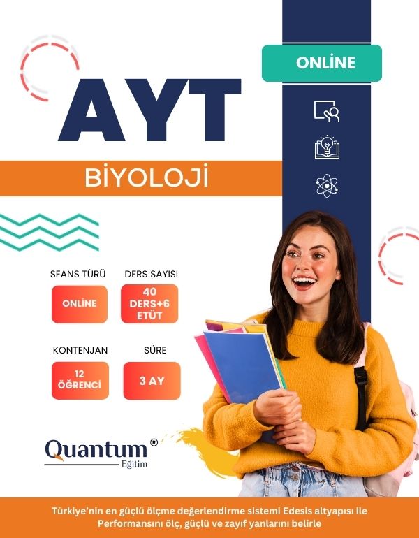 Quantum Eğitim ile AYT Biyoloji derslerine katılarak başarıyı garantileyin! 40 ders ve 6 etüt ile 3 ay boyunca, öğrenciler için özel hazırlanmış bir eğitim programı sunuyoruz. Uzman eğitmenlerimizle İnsan Fizyolojisi, Ekoloji, Genden Proteine, Bitki Biyolojisi gibi konuları derinlemesine öğrenebilirsiniz. Başarınız için her adımda yanınızdayız. Detaylı bilgi almak ve talep oluşturmak için hemen başvurun!