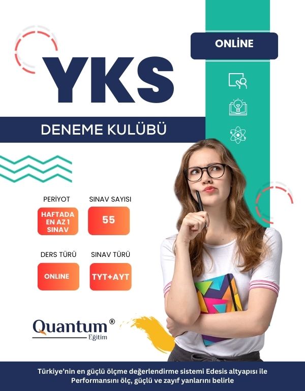 Quantum Eğitim’in Deneme Kulübü YKS programı ile sınav hazırlığınızı bir adım öteye taşıyın! Haftada bir sınav ile 55 farklı sınav deneyimi yaşama fırsatı sunan bu program, öğrenciler için özel olarak hazırlanmıştır. Onlin ders seçeneğiyle, 40 dakikalık seanslarda uzman eğitmenlerimiz tarafından rehberlik edilir. Quantum Eğitim ile başarıyı garantileyin, sınav tekniklerinizi geliştirin ve eksiklerinizi hızla tamamlayın! Detaylı bilgi almak ve hemen başlamak için bizimle iletişime geçin!