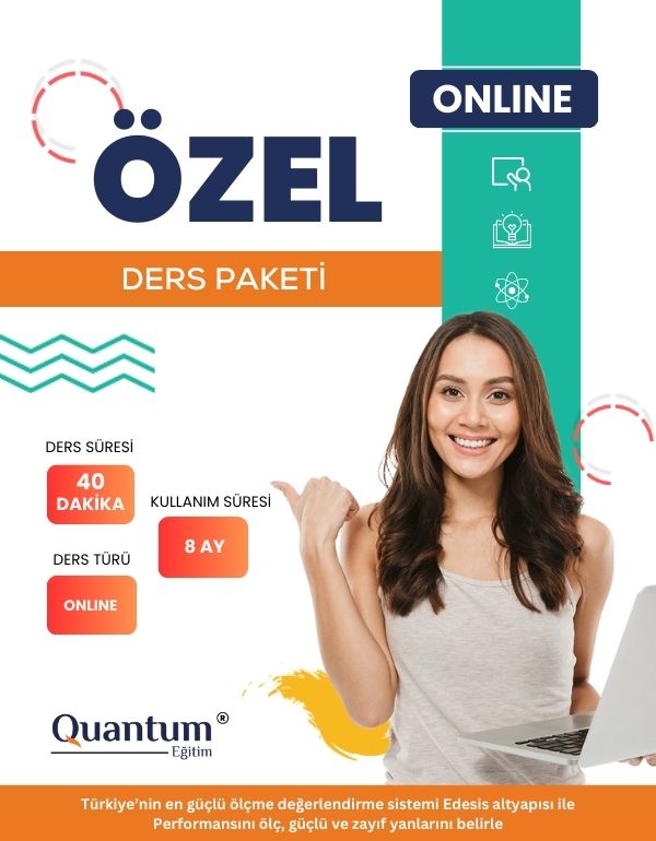 Quantum Eğitim’in Online Özel Ders Paketi, 8 ay süresince öğrencilerin başarı hedeflerine ulaşması için özel olarak hazırlanmıştır. 40 dakika süren dersler, uzman eğitmenlerimiz tarafından öğrencinin ihtiyaçlarına göre planlanır. Bu paketi aldığınızda, öğrencilerimize özel olarak ücretsiz bireysel koçluk, eğitim danışmanlığı ve demo ders imkanlarından faydalanabilirsiniz. Quantum Eğitim ile başarıyı garantileyin! Detaylı bilgi almak ve talep oluşturmak için hemen başvurun!
