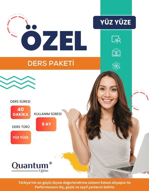 Quantum Eğitim’in Yüz yüze Özel Ders Paketi, 8 ay süresince öğrencilerin başarı hedeflerine ulaşması için özel olarak hazırlanmıştır. 40 dakika süren dersler, uzman eğitmenlerimiz tarafından öğrencinin ihtiyaçlarına göre planlanır. Bu paketi aldığınızda, öğrencilerimize özel olarak ücretsiz bireysel koçluk, eğitim danışmanlığı ve demo ders imkanlarından faydalanabilirsiniz. Quantum Eğitim ile başarıyı garantileyin! Detaylı bilgi almak ve talep oluşturmak için hemen başvurun!